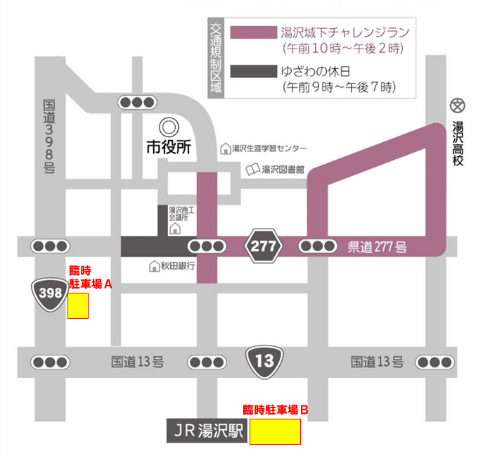 湯沢城下チャレンジランの開催に伴い、次のとおり車両の通行を規制いたします。交通規制区域を通行される場合は、係員の指示に従ってくださるようお願いします。