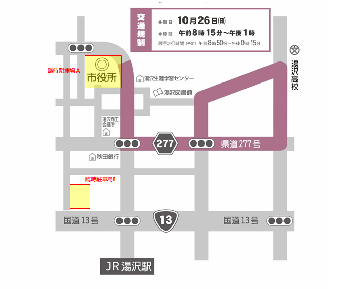 湯沢城下チャレンジランの開催に伴い、次のとおり車両の通行を規制いたします。交通規制区域を通行される場合は、係員の指示に従ってくださるようお願いします。
